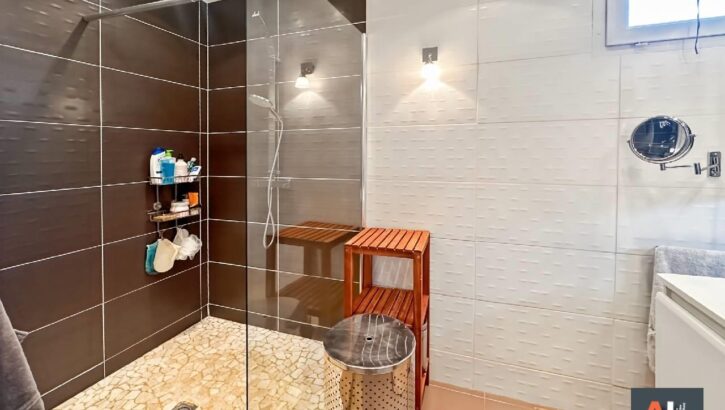 A l’étage, un dégagement distribue une grande chambre parentale avec dressing aménagé, deux chambre avec placard, salle d’eau.